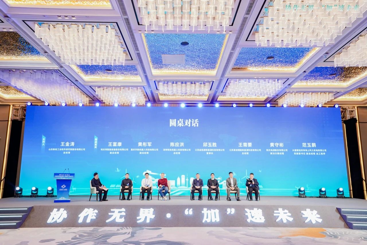 埃夫特智能装备股份有限公司副总经理王富康、重庆华数机器人科技有限公司副总经理黄彤军、深圳怪虫机器人科技有限公司总经理陈应洪、江苏益佳通新能源科技有限公司董事长邱玉胜、江苏景创锂能新能源科技有限公司总经理王需要、阳光电源股份有限公司解决方案经理黄守彬、大唐国信滨海海上风力发电有限公司党委副书记副总经理总工程师范玉鹏共同参与,并就新能源行业未来走向,机器人解决方案现状、合作现状、升级创新方向、合作路径等议题同台共话。本次对话由山东新松工业软件jiuyou.com九游股份有限公司总经理王金涛主持。